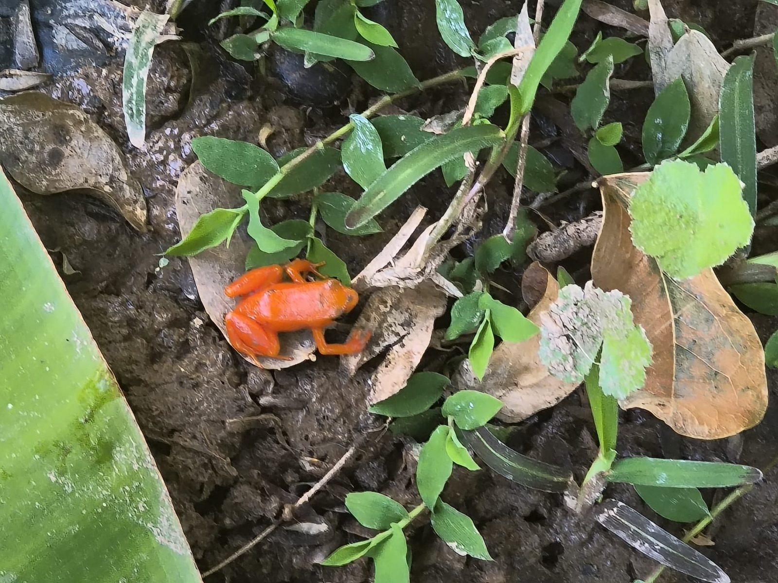 Auch Tomatenfrösche und die winzige goldene Mantella, ein orangefarbenes Fröschchen, nicht größer als mein Daumennagel, leben hier.