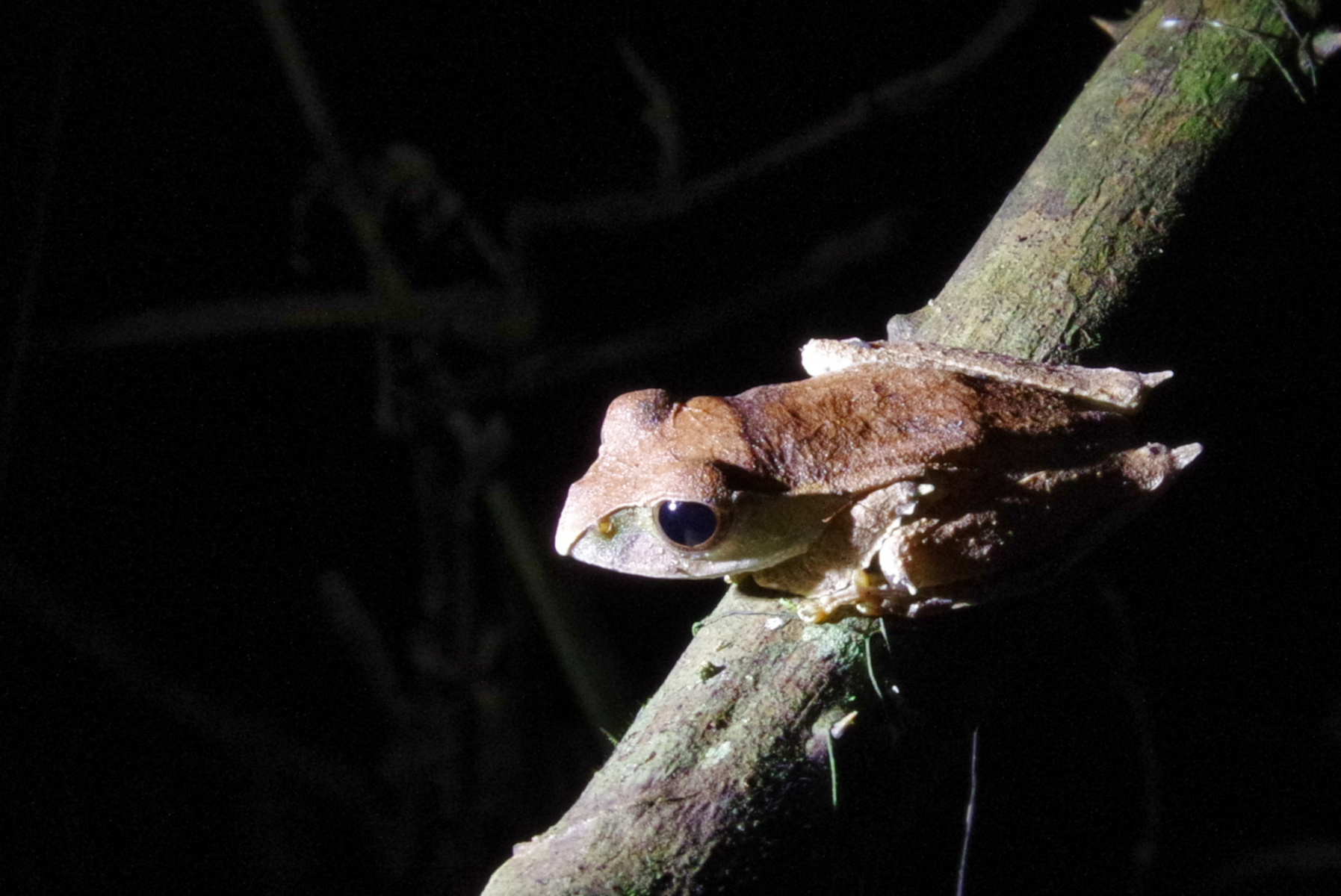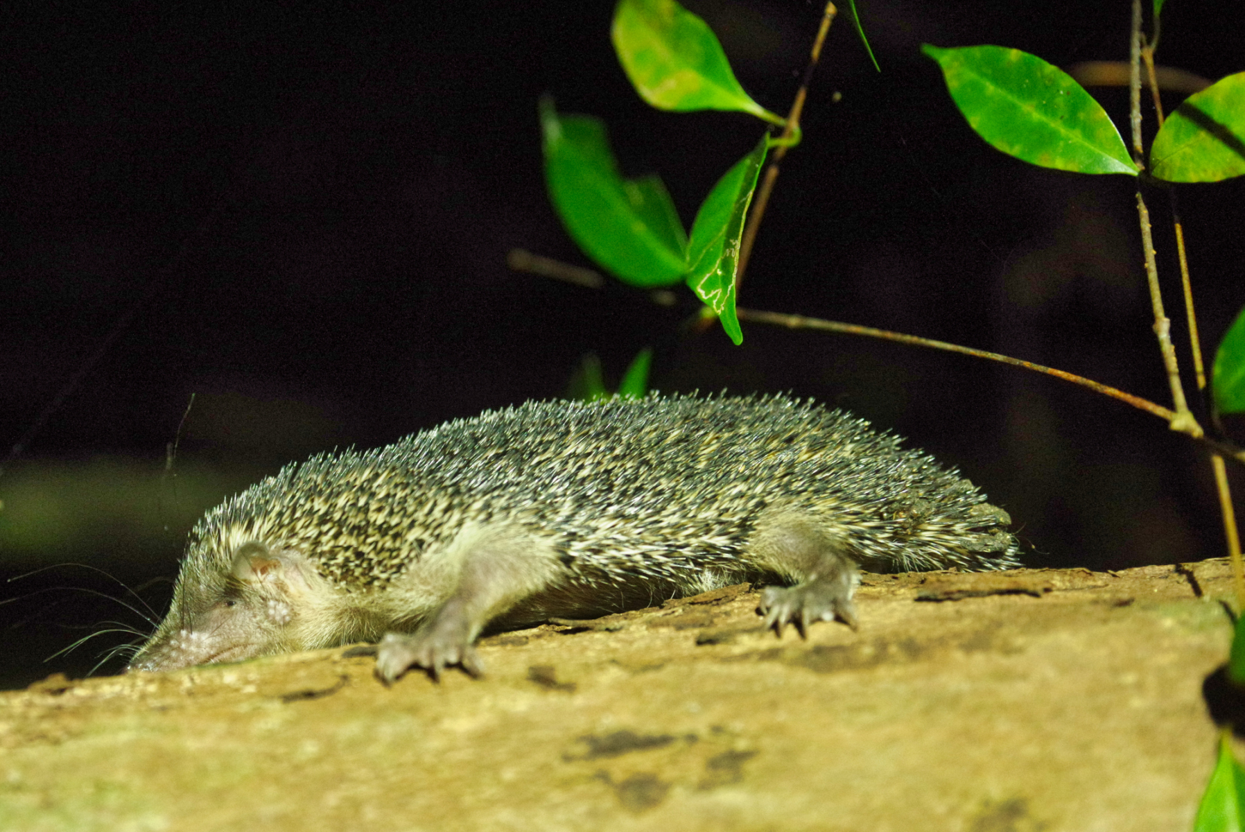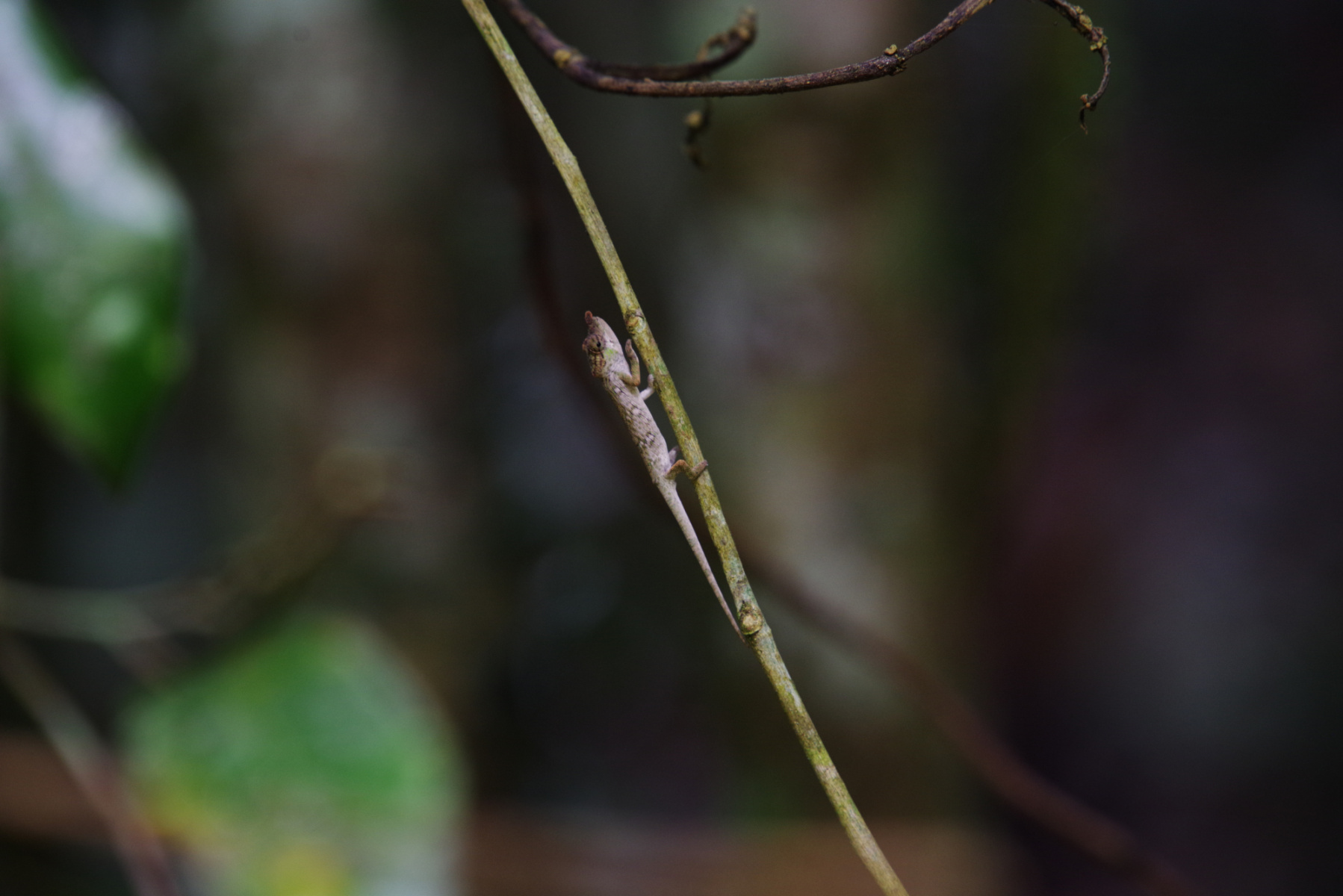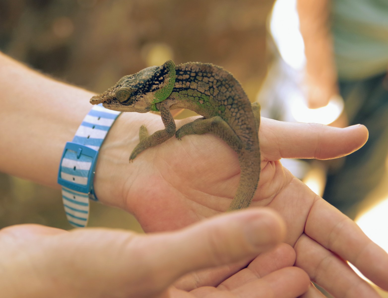 Mario, unser engagierter Guide, zeigt uns bei der Nachtwanderung gestern, was das Palmarium Reservate außer Lemuren, bequemen Bungalows und gutem Essen noch zu bieten hat: unter anderem finden wir den großen Baumfrosch, boophis grandis, und ein winziges Chamäleon, das erst 2022 erstbeschrieben wurde. Nun sind zweiunddreißig Brookesiaarten aus Madagaskar bekannt. Aus Angst vor Schlangen schläft der Winzling auf Zweigen knapp über dem Boden, sodass auch der Fotograf sich nur liegend in Position bringen kann. Zum Glück sind die Schlangen hier nicht giftig. Die nachtaktiven Mausmakis und Wollmakis sind in den Bäumen nur durch ihre im Schein der Lampen aufleuchtenden Augen zu erkennen, ebenso die kleine östliche Madagaskareule, der wir eine Weile durchs nächtliche Dickicht hinterher jagen. Auch ein junger furchtsamer Madagaskar Igel flüchtet vor uns durchs raschelnde Laub auf einen Baum.