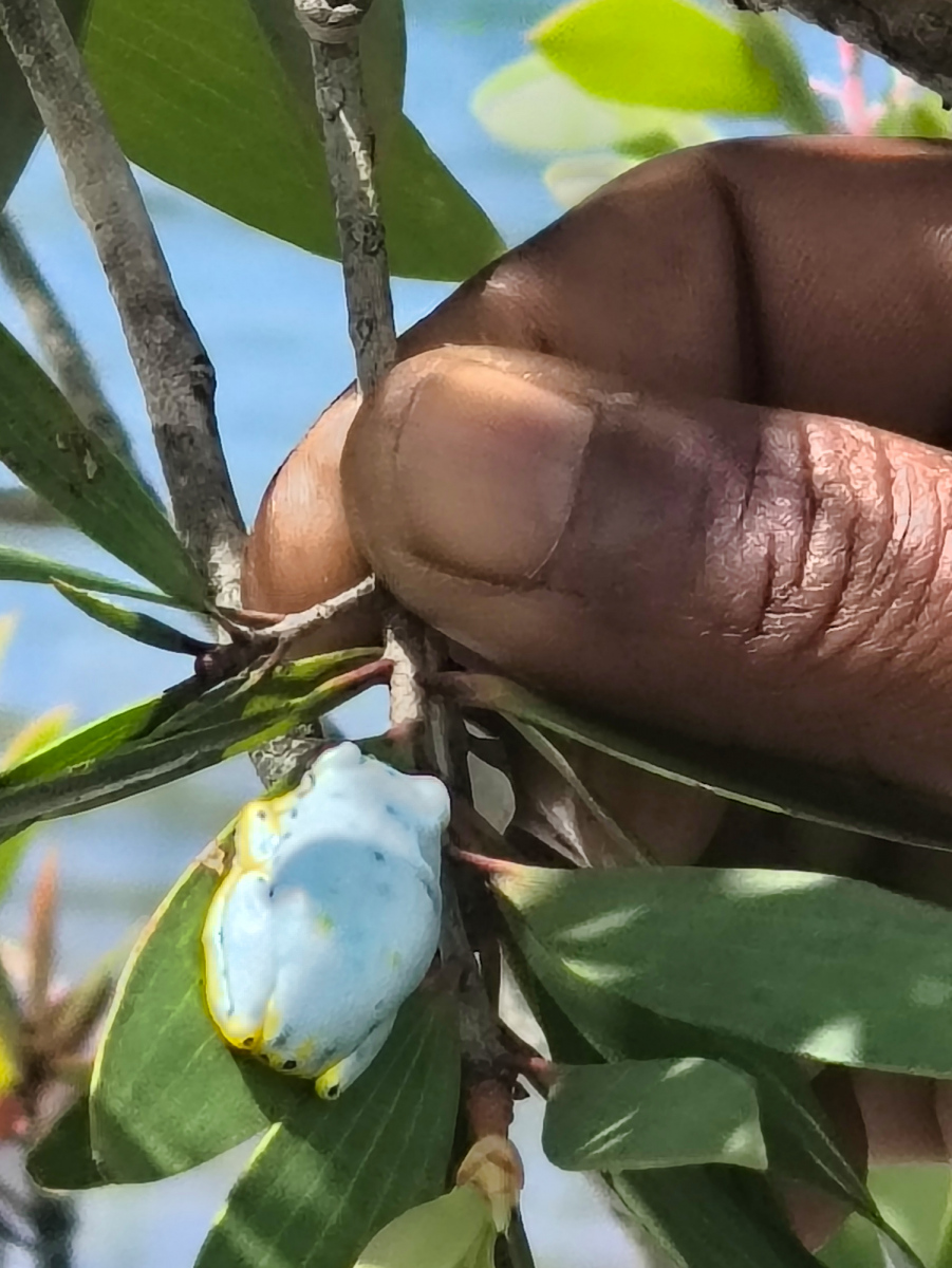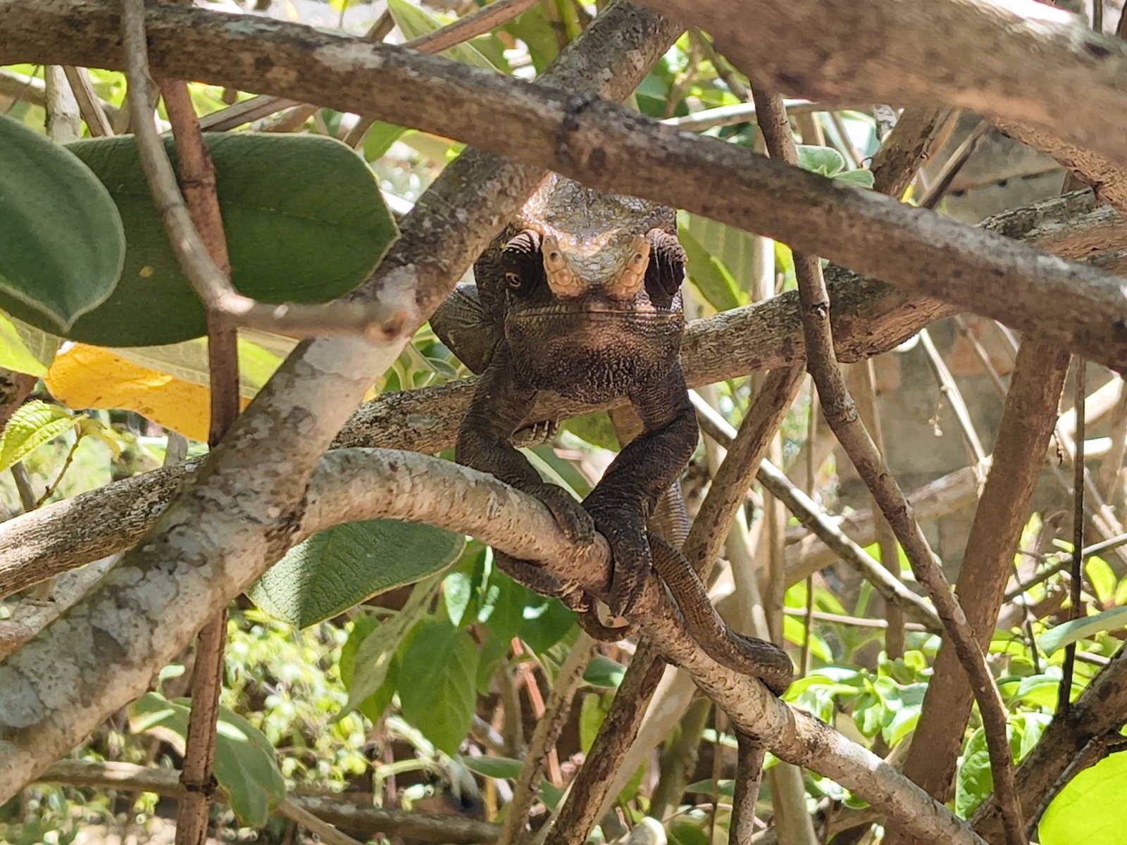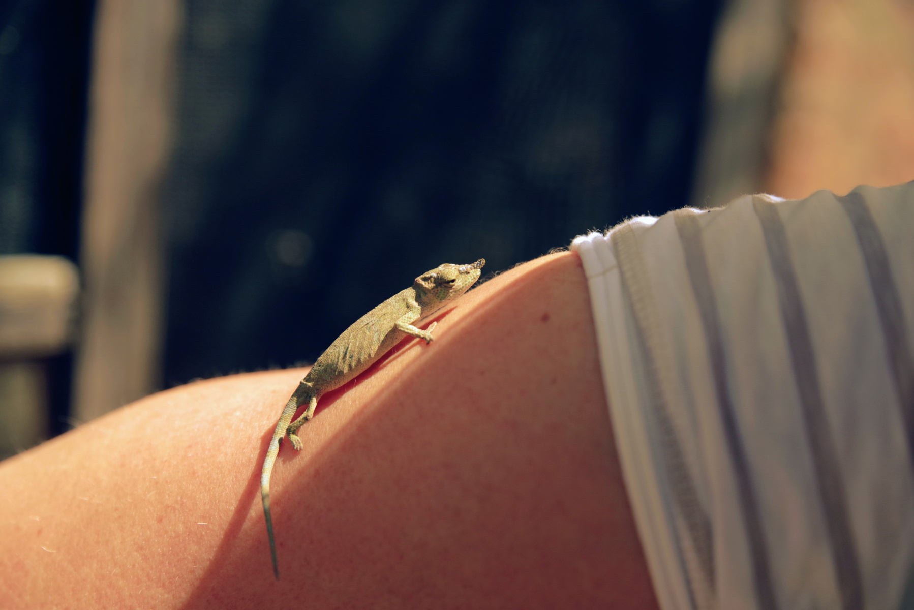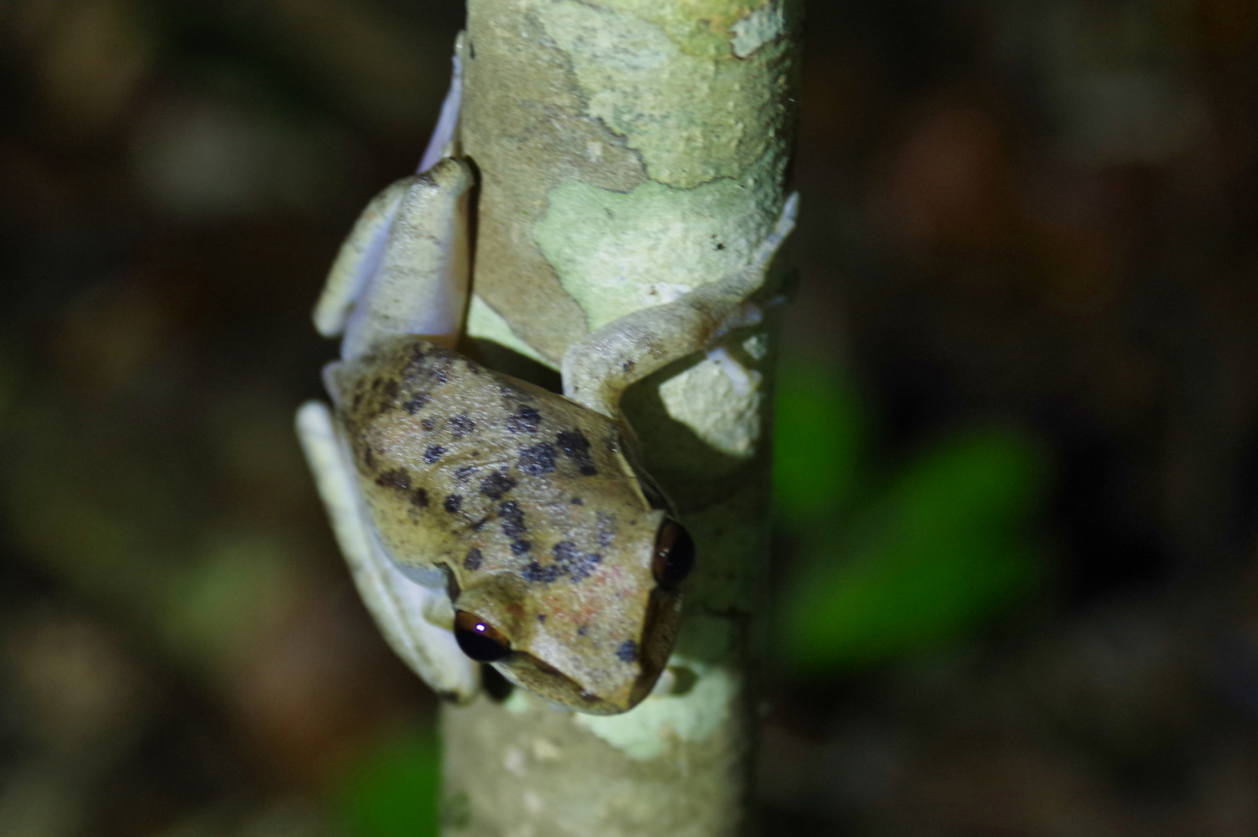 Mario, unser engagierter Guide, zeigt uns bei der Nachtwanderung gestern, was das Palmarium Reservate außer Lemuren, bequemen Bungalows und gutem Essen noch zu bieten hat: unter anderem finden wir den großen Baumfrosch, boophis grandis, und ein winziges Chamäleon, das erst 2022 erstbeschrieben wurde. Nun sind zweiunddreißig Brookesiaarten aus Madagaskar bekannt. Aus Angst vor Schlangen schläft der Winzling auf Zweigen knapp über dem Boden, sodass auch der Fotograf sich nur liegend in Position bringen kann. Zum Glück sind die Schlangen hier nicht giftig. Die nachtaktiven Mausmakis und Wollmakis sind in den Bäumen nur durch ihre im Schein der Lampen aufleuchtenden Augen zu erkennen, ebenso die kleine östliche Madagaskareule, der wir eine Weile durchs nächtliche Dickicht hinterher jagen. Auch ein junger furchtsamer Madagaskar Igel flüchtet vor uns durchs raschelnde Laub auf einen Baum.