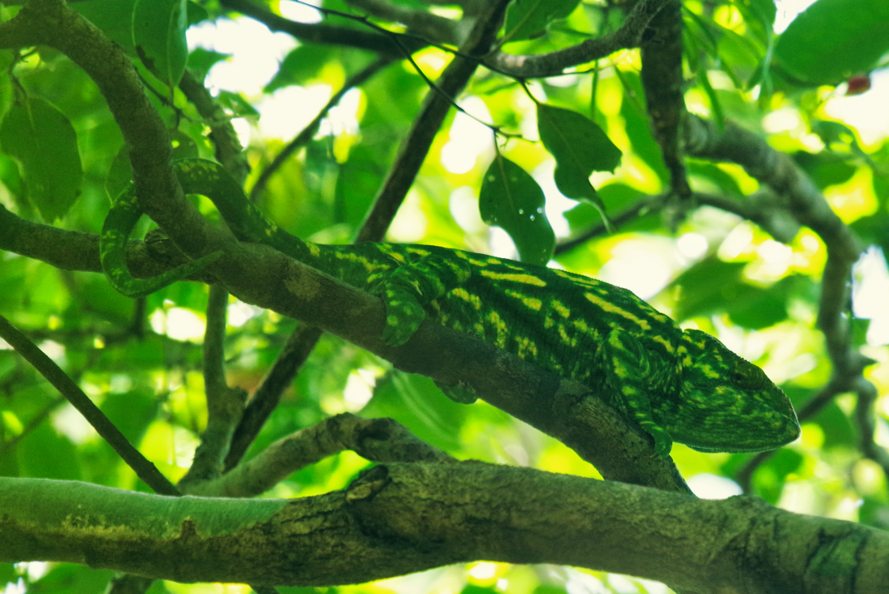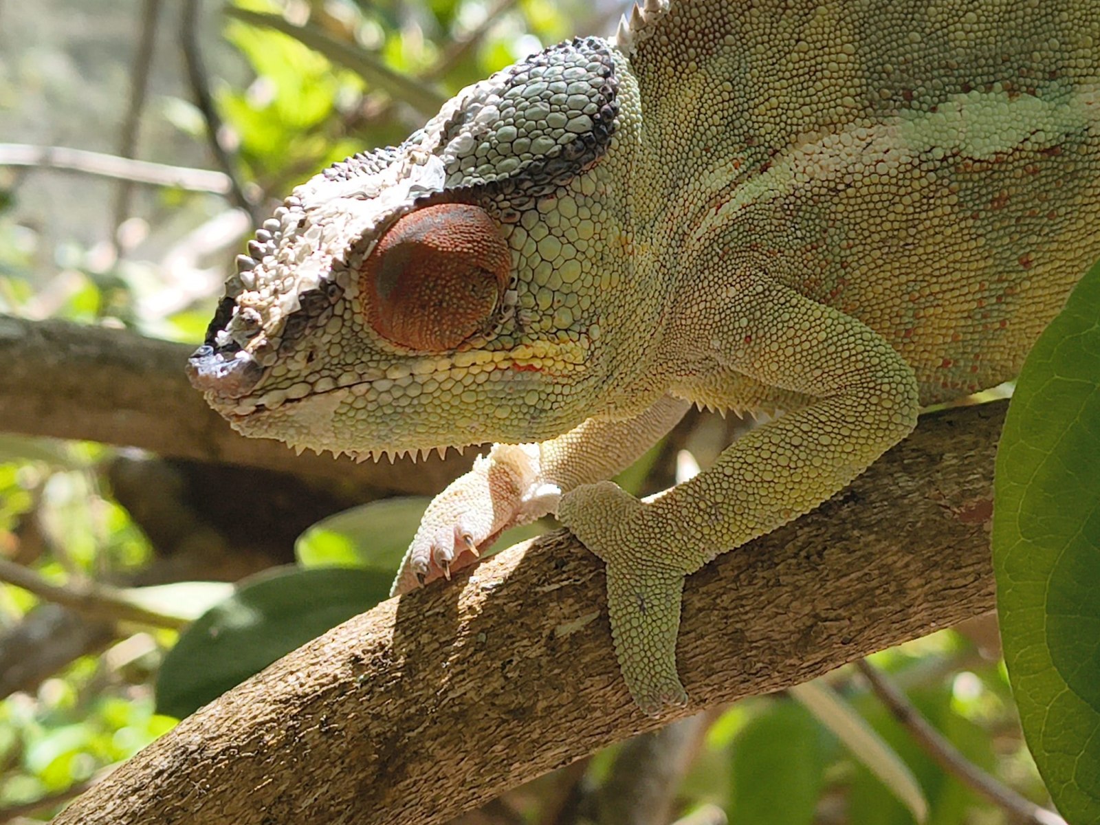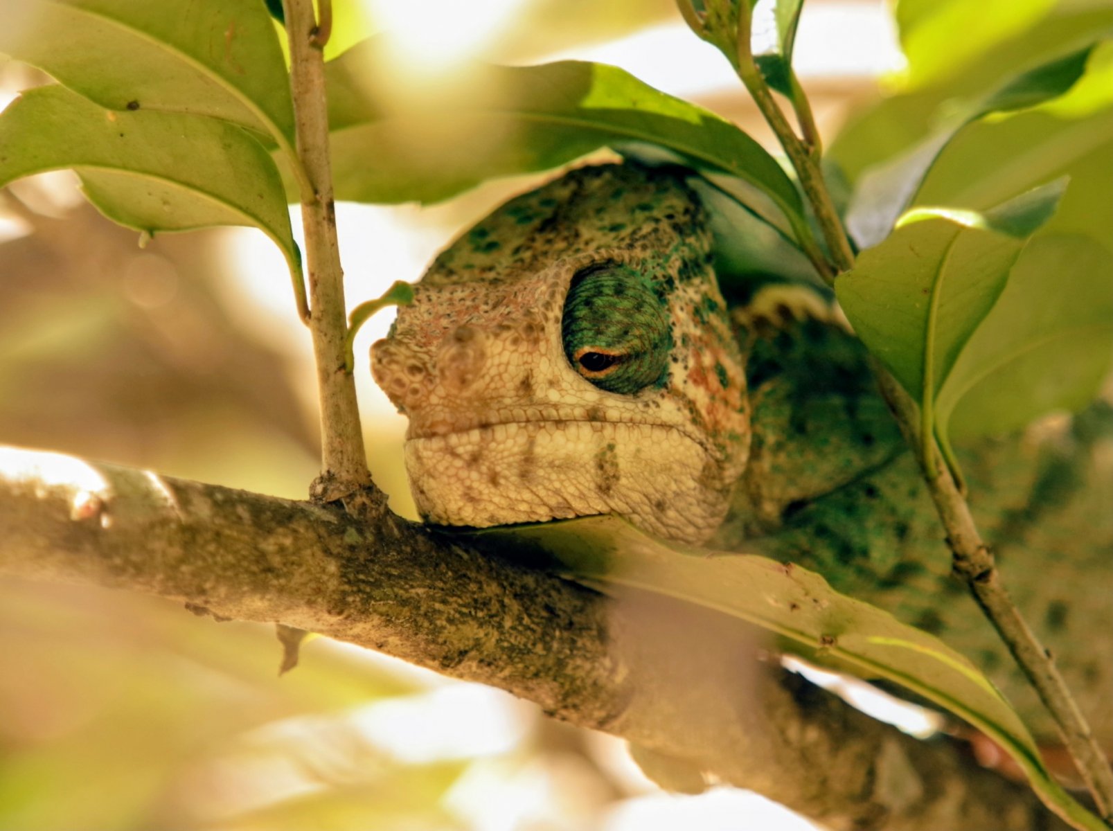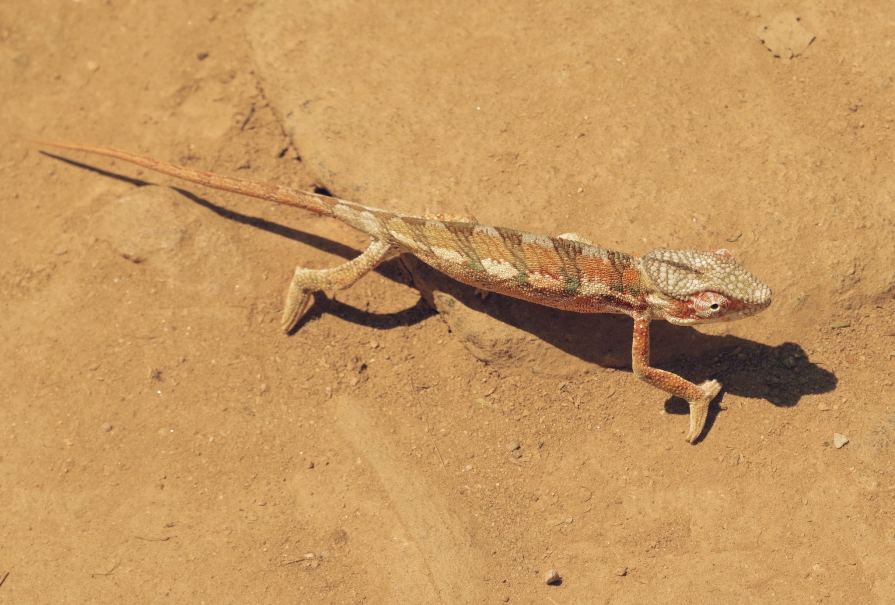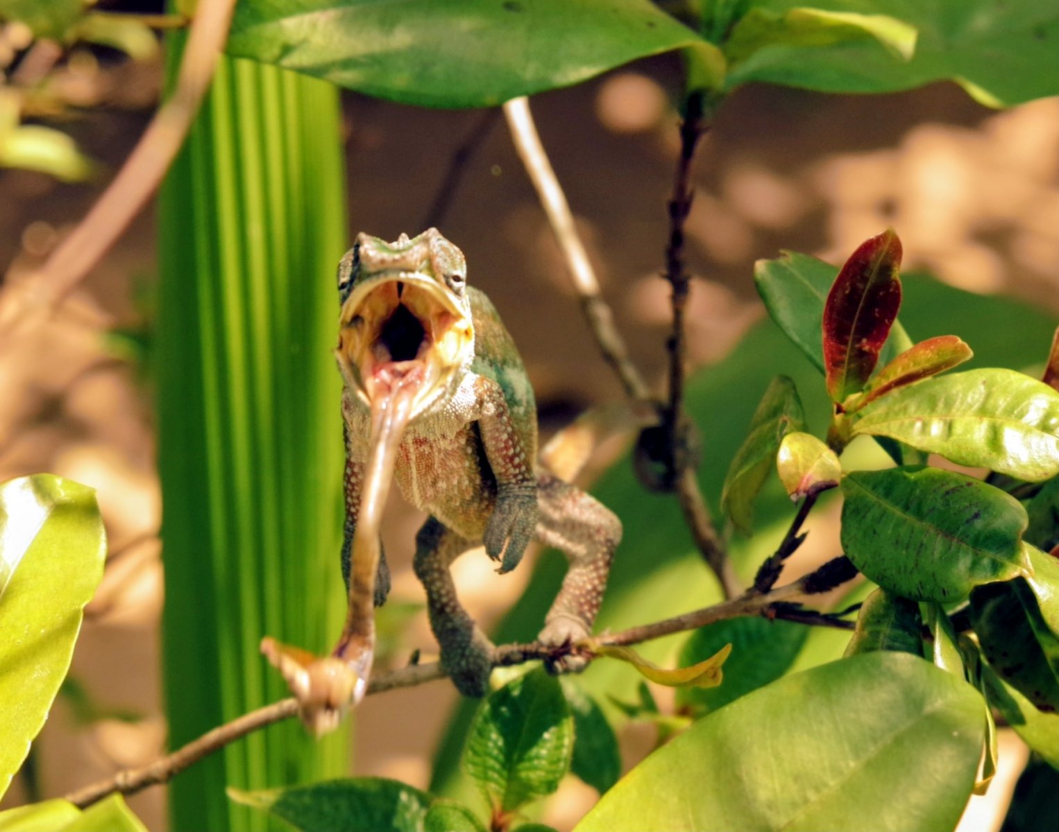 Gegen Mittag erreichen wir den Madagaskar exotic Park, eine Art Privatzoo und treffen unsere ersten Lemuren. Coquerel Sifakas stammen zwar aus dem Westen, sie sind hier jedoch fast zahm und lassen sich anfassen und füttern. Zwei Familie leben frei auf dem Gelände. Die Chamäleons werden in einer Voliere gehalten, damit sie nicht den Vögeln zum Opfer fallen. Fünf Arten können wir hier bestaunen. Jetzt in der Mittagshitze sitzen sie verschlafen im Geäst und äugeln Träge zwischen den Blättern hindurch. Nein, eines ist hungrig und zeigt wie rasch eine Heuschrecke verschwinden kann! Der Fotograf ist selig.