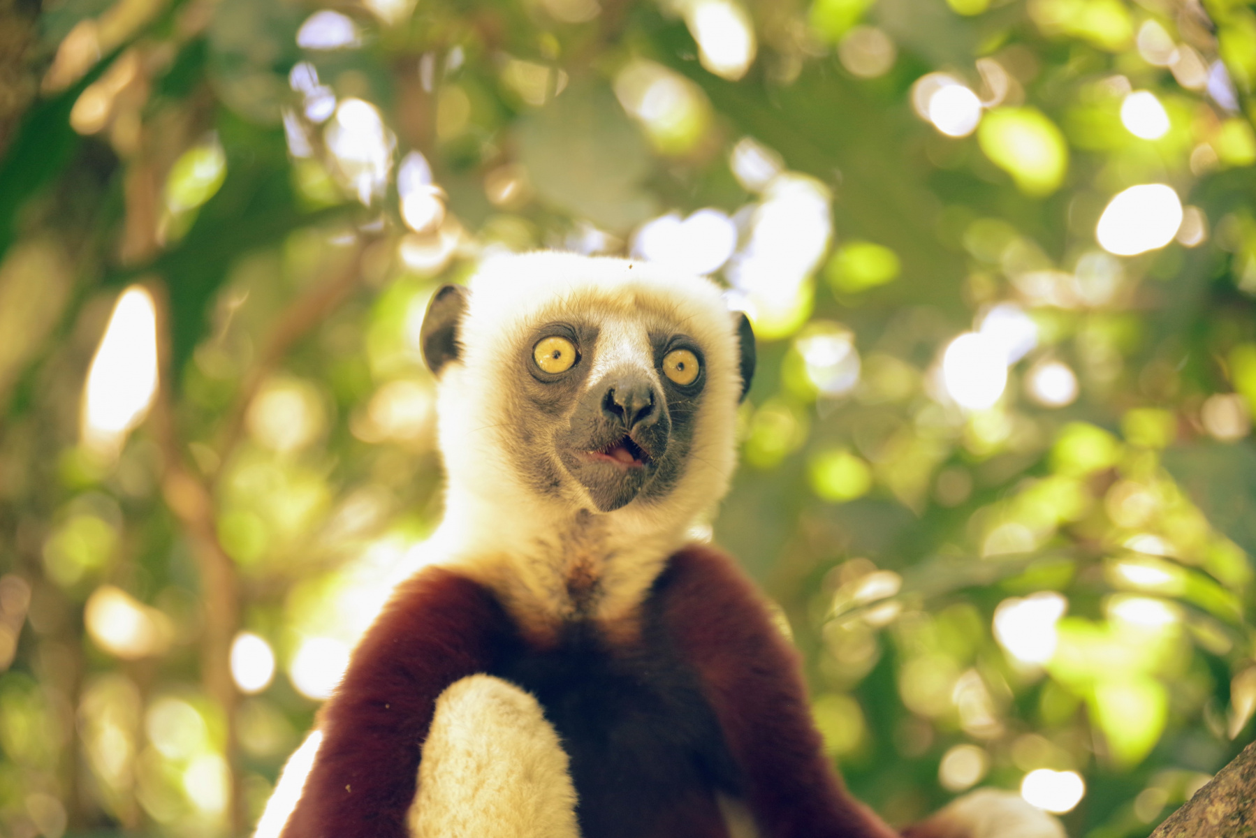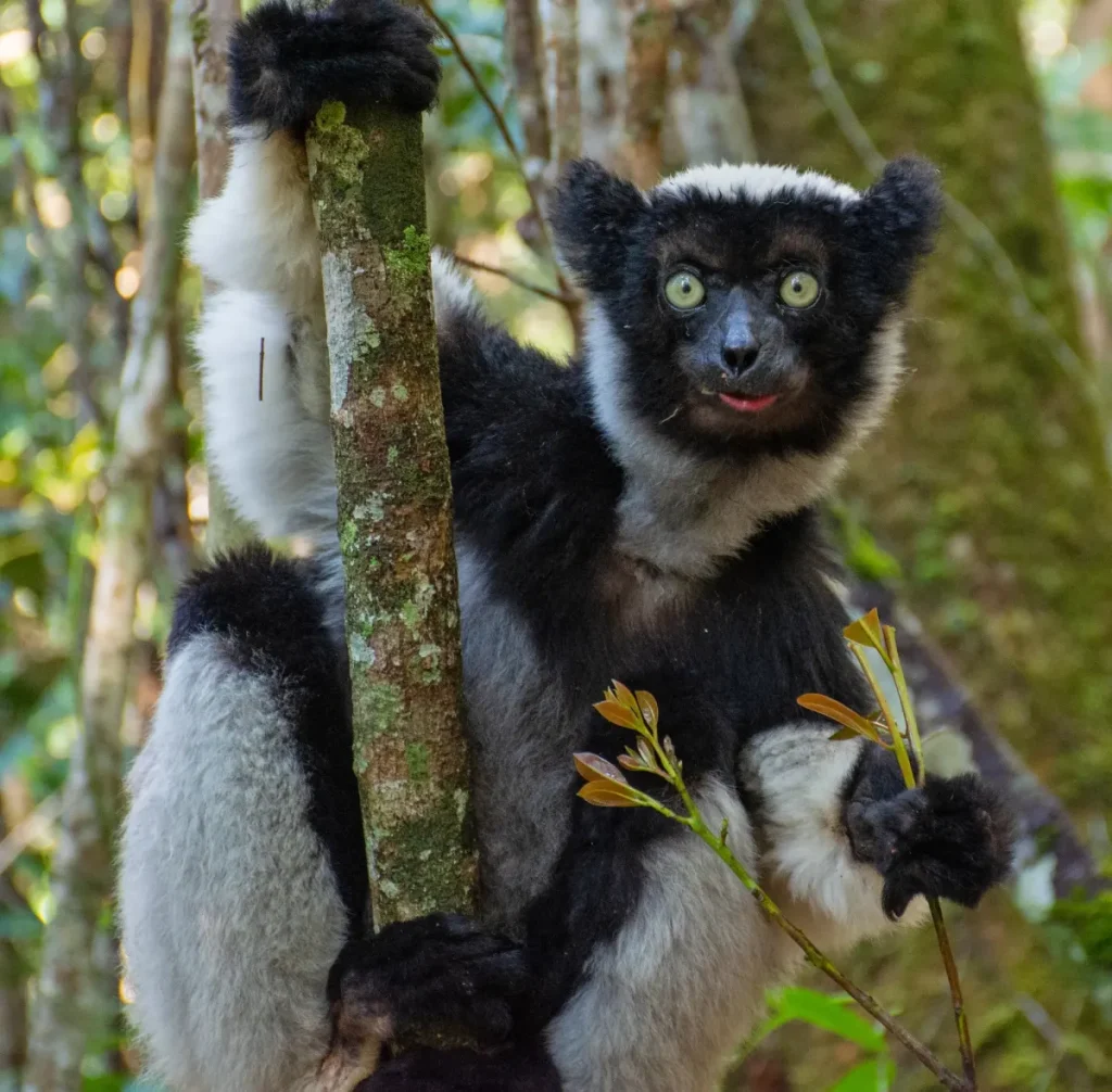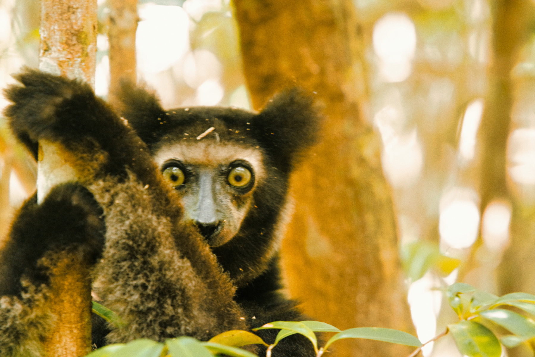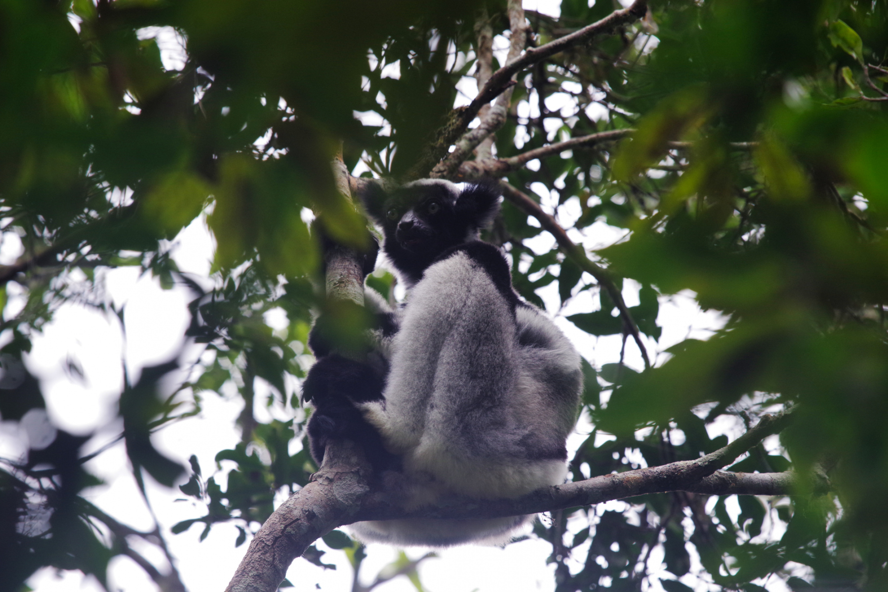 Ameisennester hängen herab, Hügel bauen hier die Termiten. Vor dem Innenleben der Padanuspflanze werden wir gewarnt: neben kleinen Krabben sollen hier auch giftige Skorpione hausen, neben den Boden lebenden Myriapoda die einzigen giftigen Tiere hier. Dann hören wir schon von weitem die Rufe der Indris! Wir stolpern unserem Guide durchs Unterholz hinterher – und da, da sitzt der größte der Lemuren und grinst uns mit seinem schwarzen Teddybärengesicht an. Einfach cool!