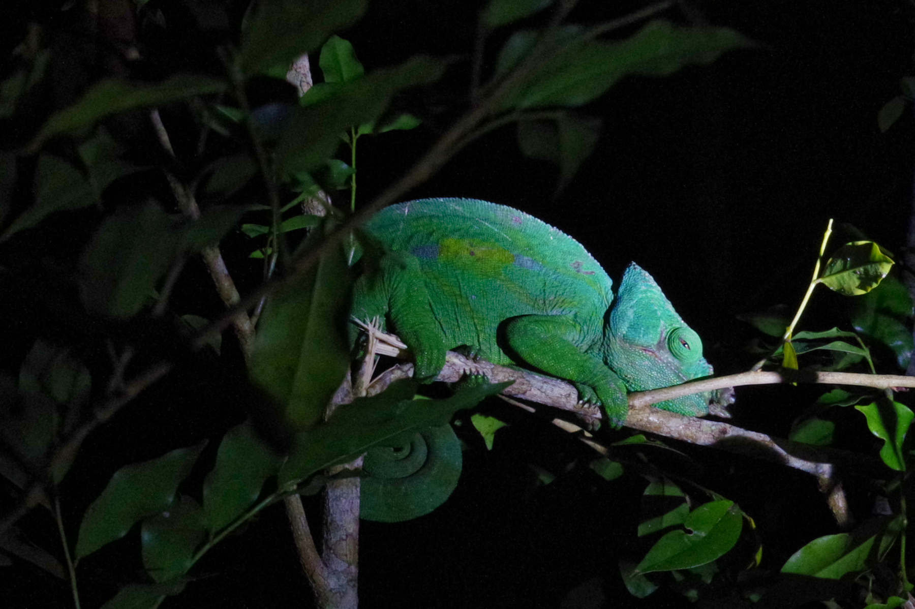 Von der Longoza Ecolodge sind drei Reservate zu Fuß zu erreichen. Bereits gestern Abend sind wir im VOIMMA park herum spaziert. Dieser wird von den Einheimischen hier geführt. Blitzende Punkte in der Dunkelheit – ein Goodman mouselemur, mit nur 17 cm hier der Kleinste, sitzt im Geäst. Und da oben – eine Familie der eastern wooly lemurs frisst von den Blättern: Vater, Mutter und Baby! Leider in der Finsternis nicht nah genug zum Fotografieren. Ein Parson´s Chamäleon blinzelte träge von seinem Ast und beim Fluss sitzt das Fröschchen Boophis madakascarensis auf einem Zweig. Ohne Guide wären wir wohl an all den Tieren vorbei gelaufen.