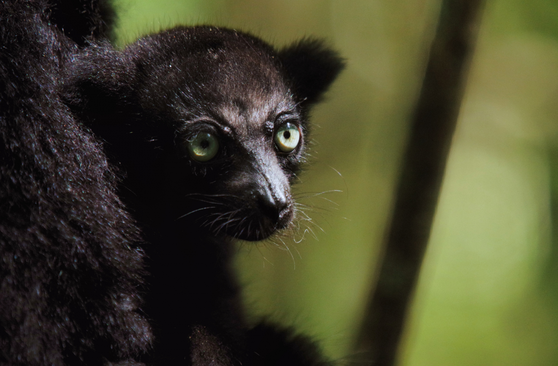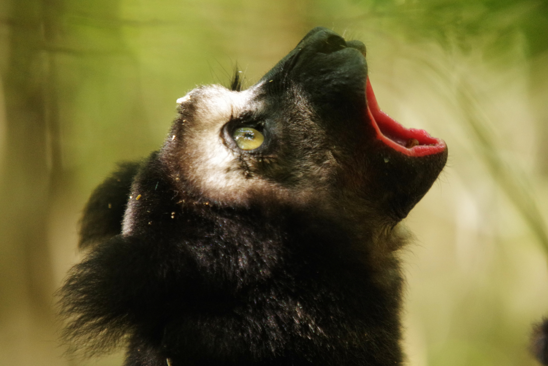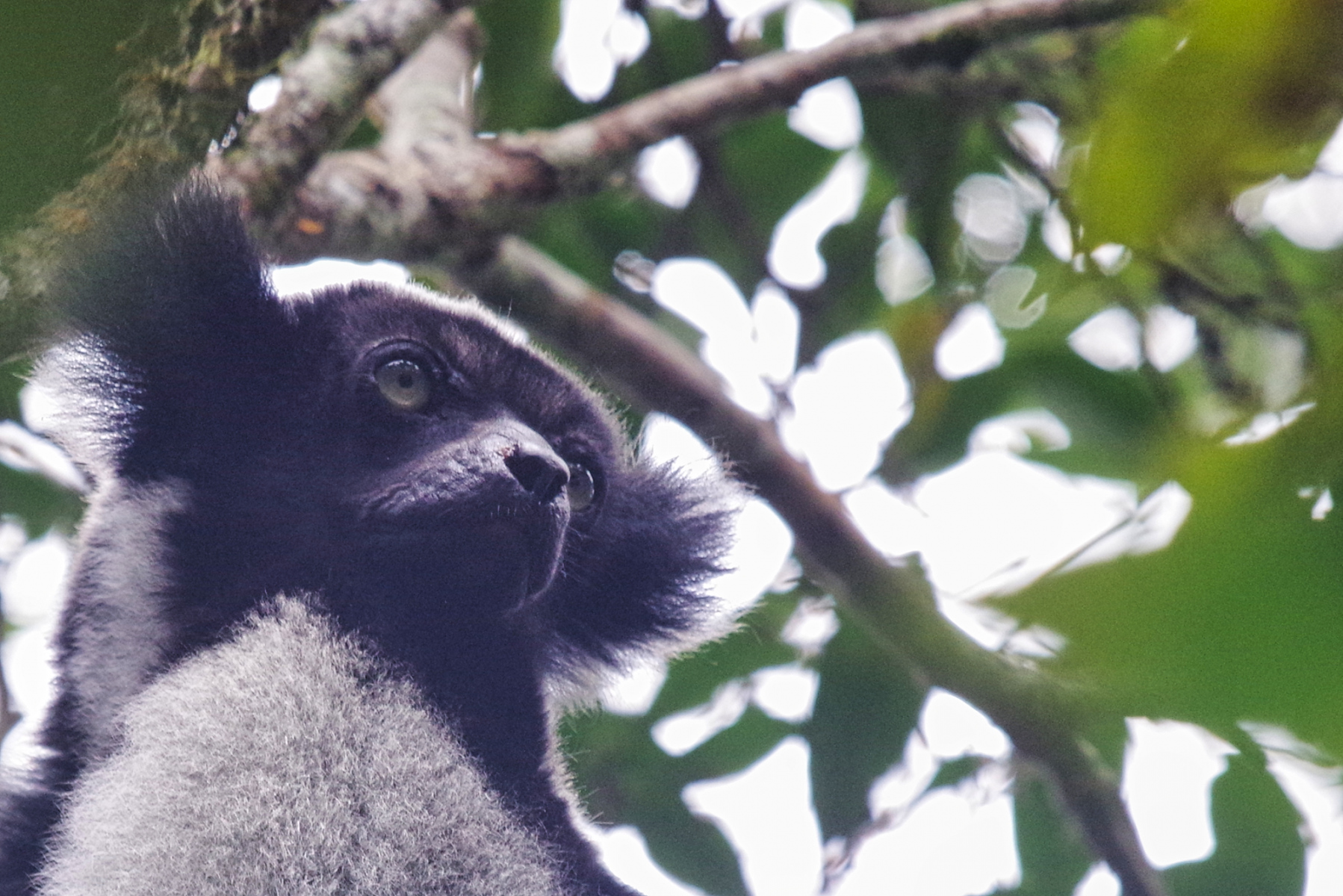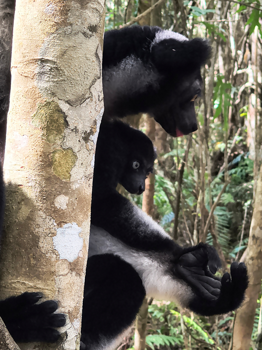 Zuerst zeigen sich Mischlinge der Kronenmakis mit Mohrenmakis, dann auch das mangels Alternativen hier fremdgehende Weibchen der Mohrenmakis: braun, denn schwarz sind bei denen nur die Männchen. Den Rufen aus dem Urwald folgend pirschen wir uns an die Indris heran. Eine Mama mit Baby ist dabei! Der Kleine ist drei Monate alt und lugt noch etwas ängstlich aus dem Fell seiner Mutter hervor.