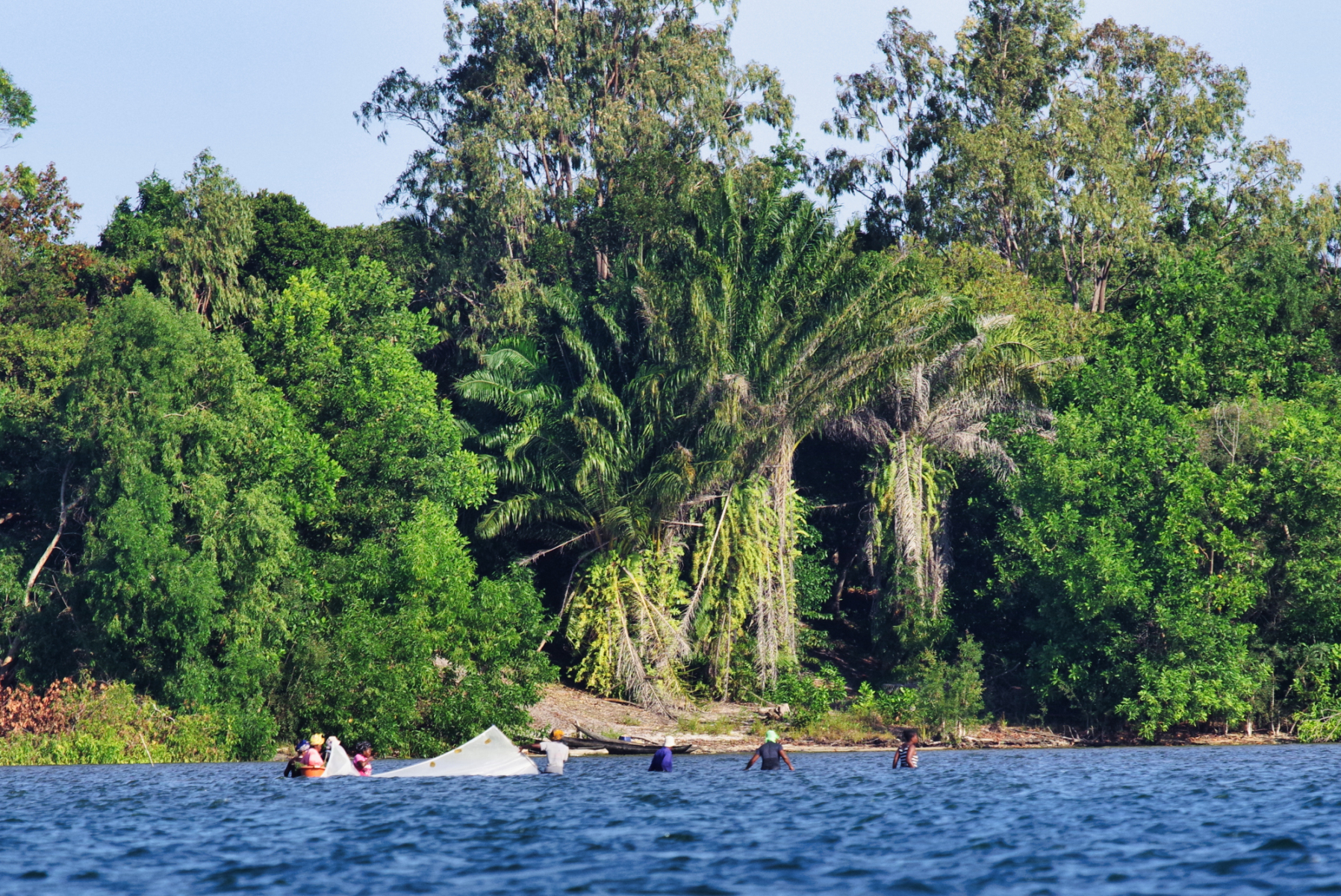 Gegen 10:00 kommt Bewegung in das wartende Volk, der anwesenden Gendarm hat alle Mühe den run auf die Barkasse zu stoppen und die Dinge wieder in geordnete Bahnen zu lenken. Er ruft die Passagiere laut seiner Liste auf, dann dürfen wir eine Schwimmweste ausfassen und über eine Holztreppe ins bereits gut gefüllte Boot klettern. Das erste Mal nasse Füße.