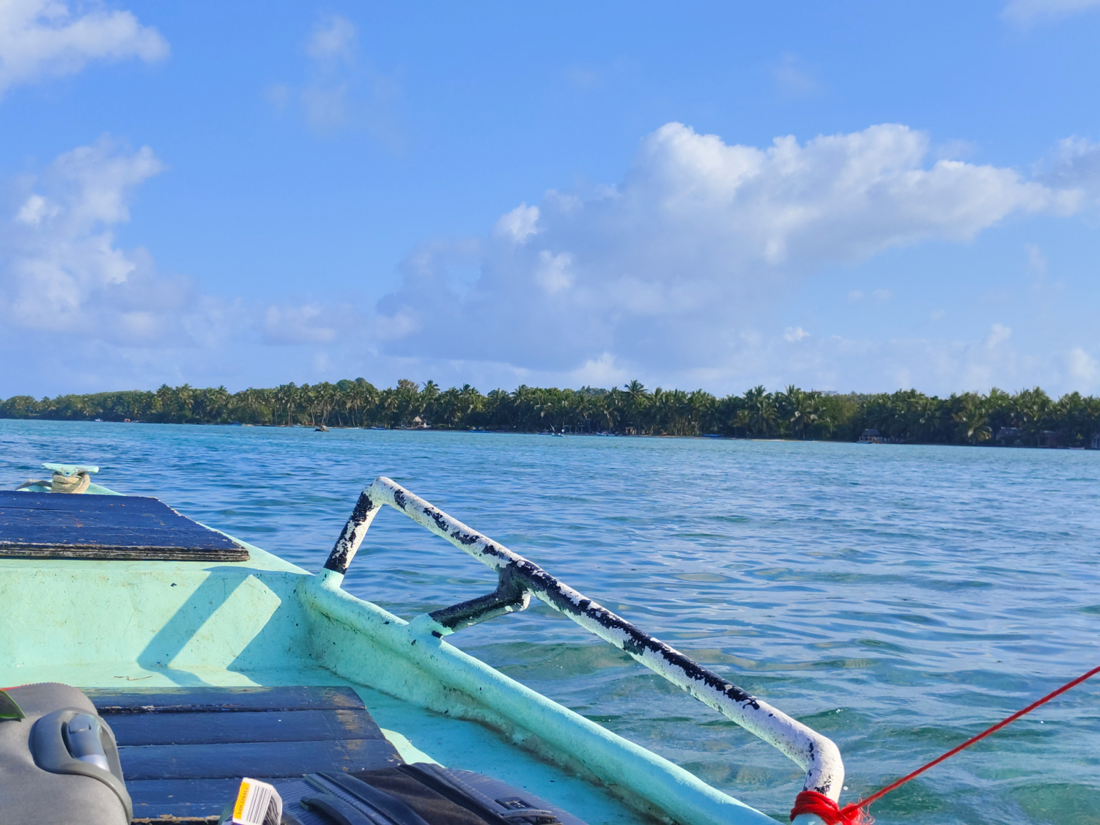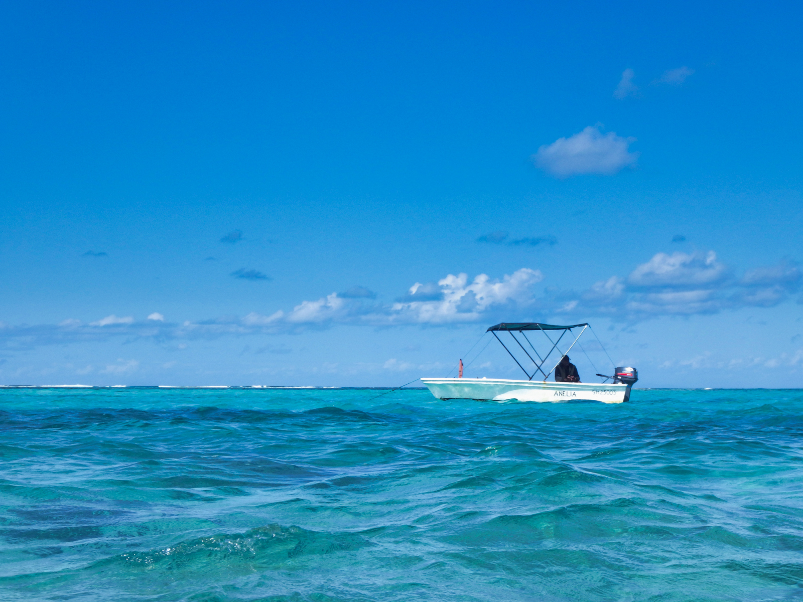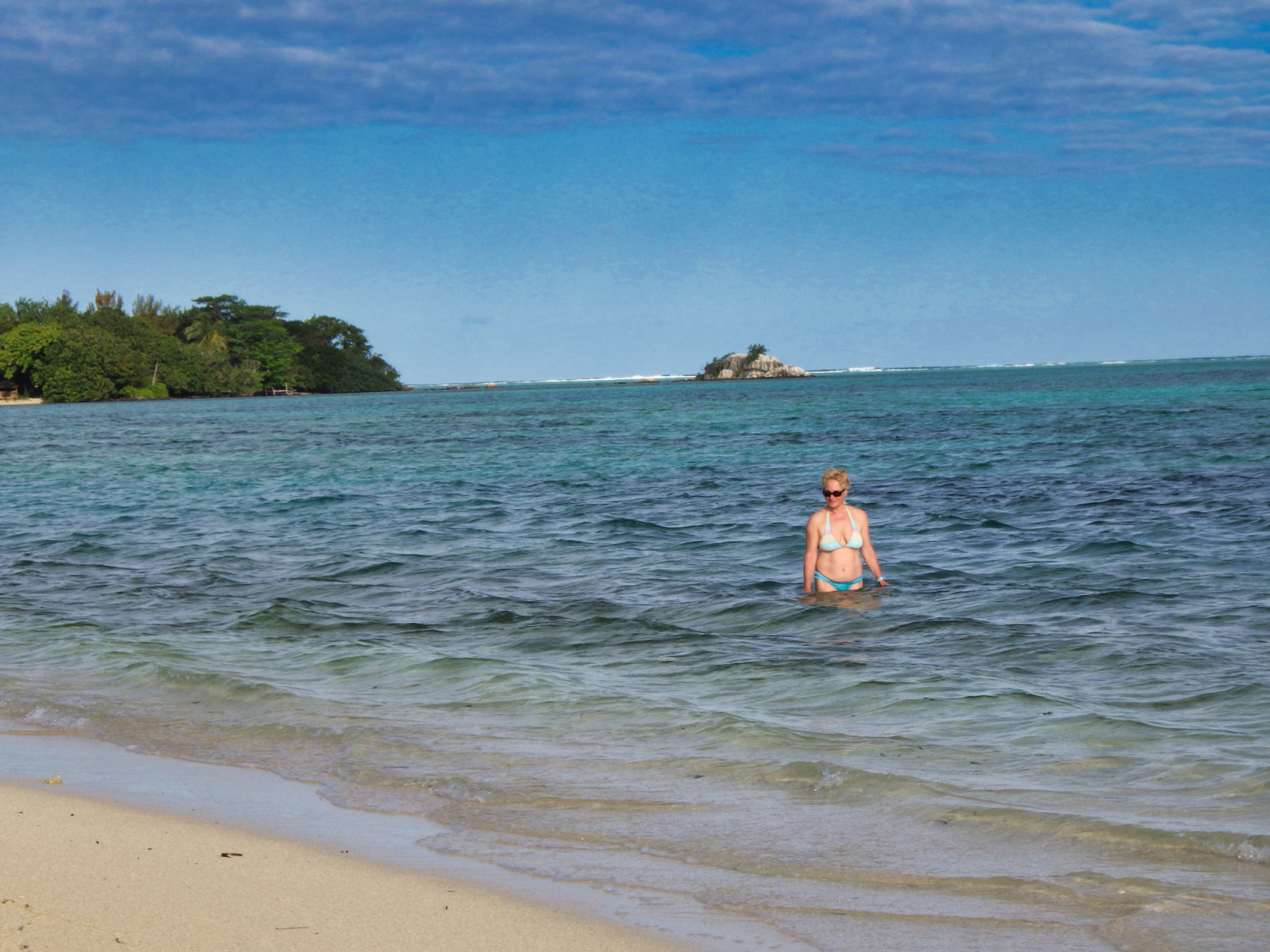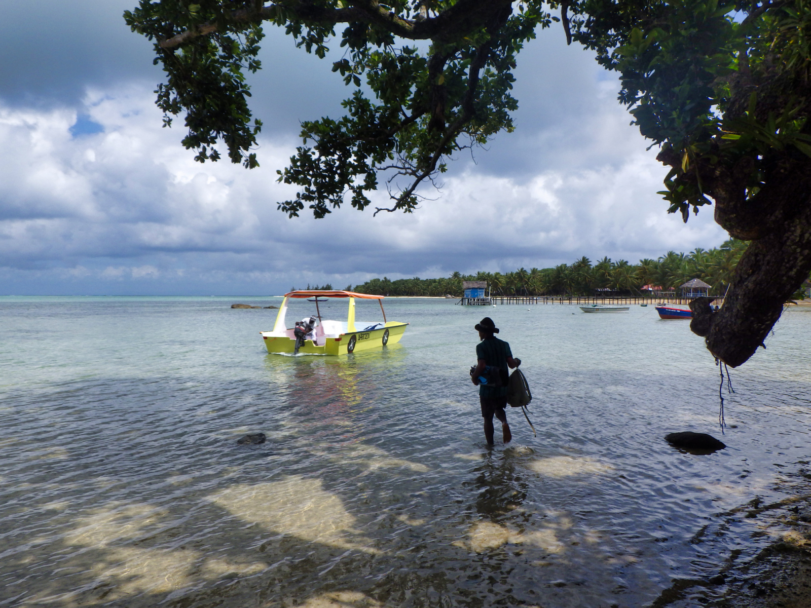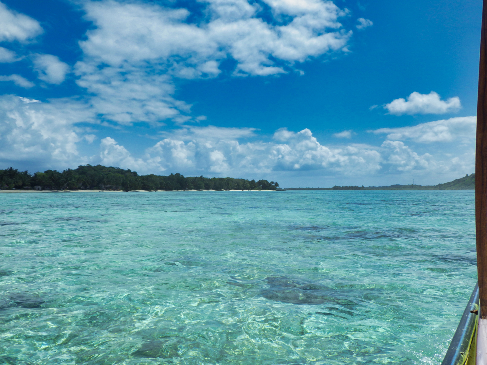 Palmengesäumte Traumstrände an Steuerbord, das Riff an Backbord, erreichen wir unsere Bleibe auf der Ile aux Nattes. Alles aussteigen – durch das seichte Wasser waten wir zur Aurora Lodge.