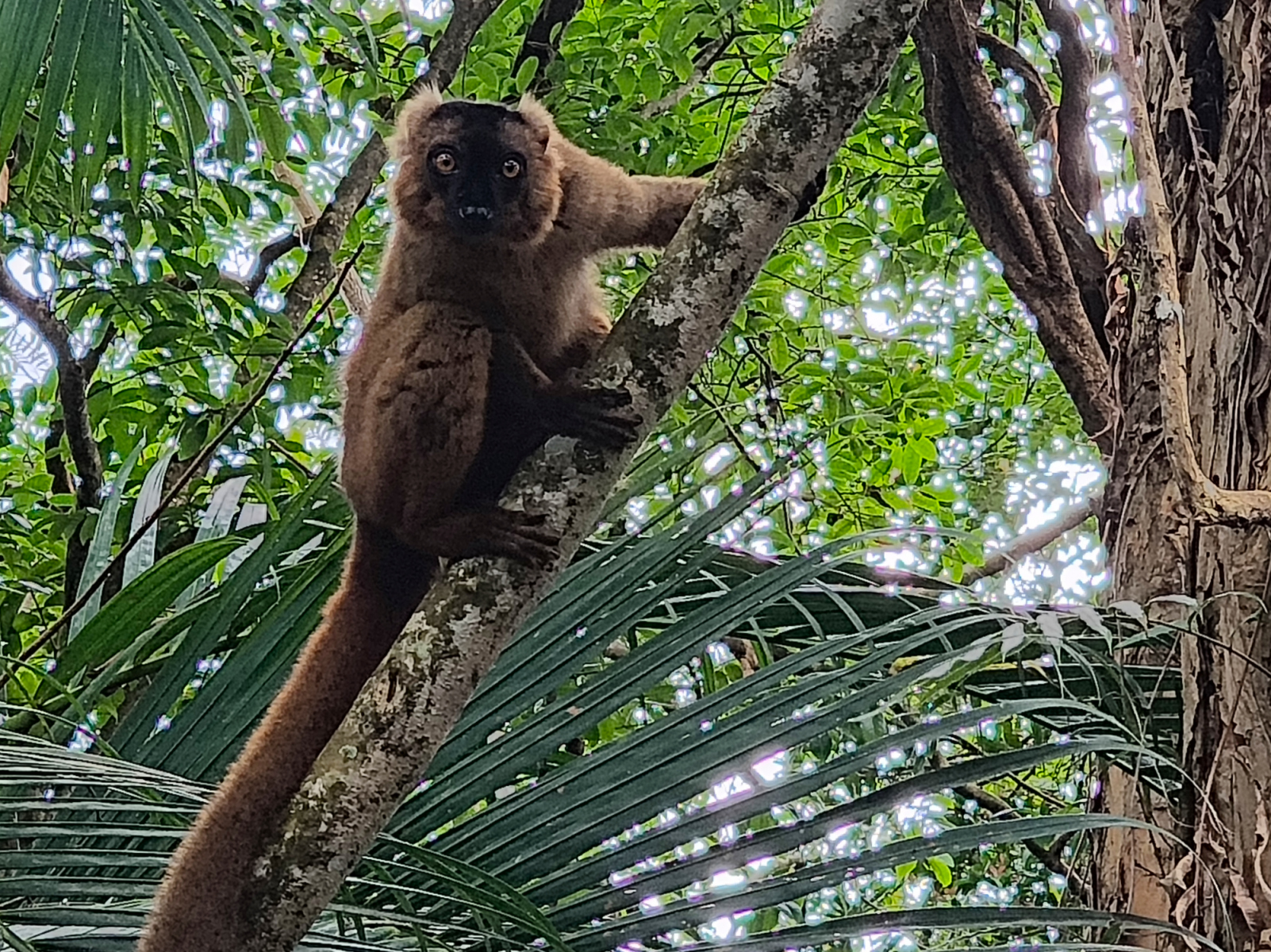 Wir bekamen ein Upgrade ins Baumhaus, Lemuren (common brown) hüpfen um uns herum, und wenn man nicht aufpasst klauen sie das Frühstück.