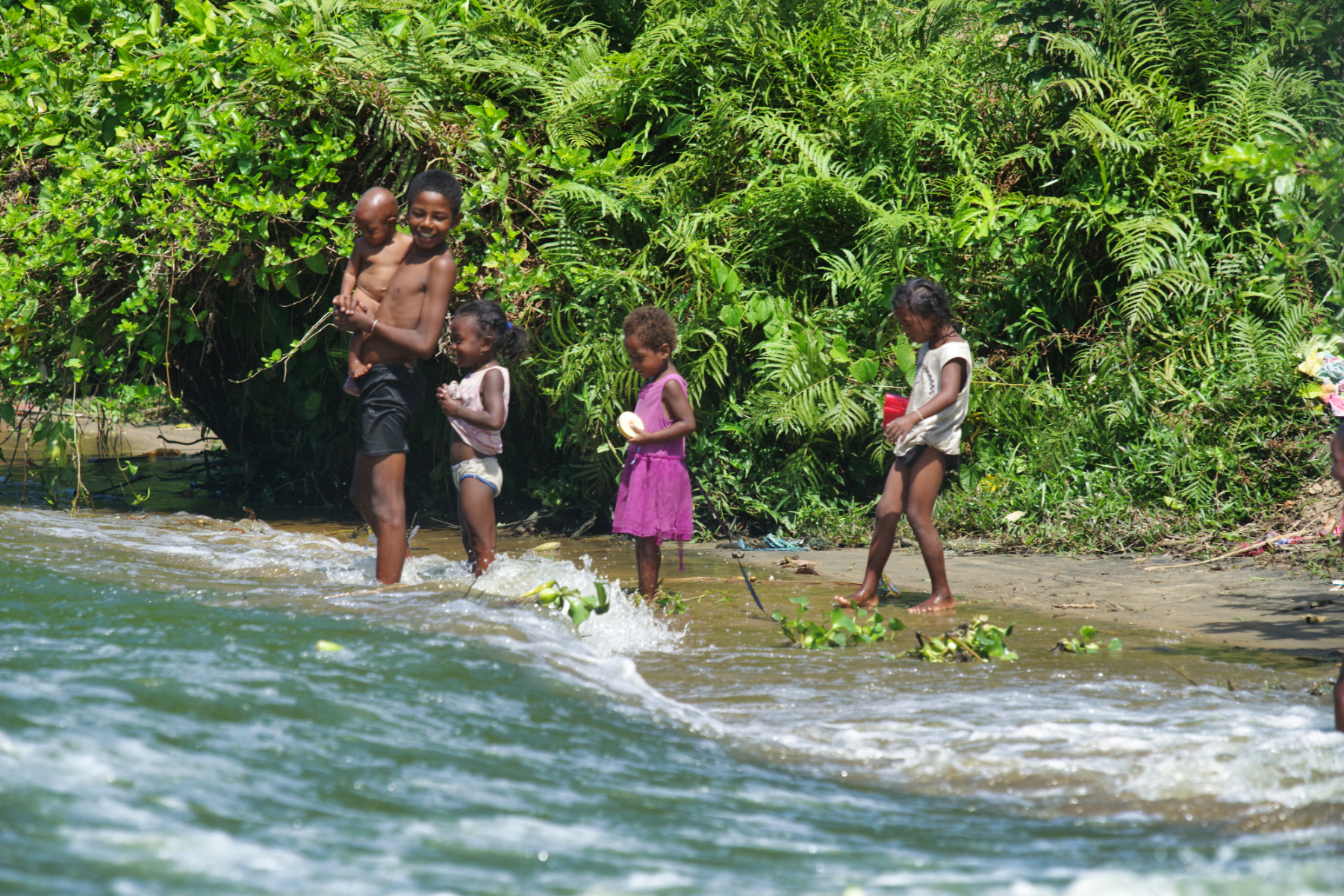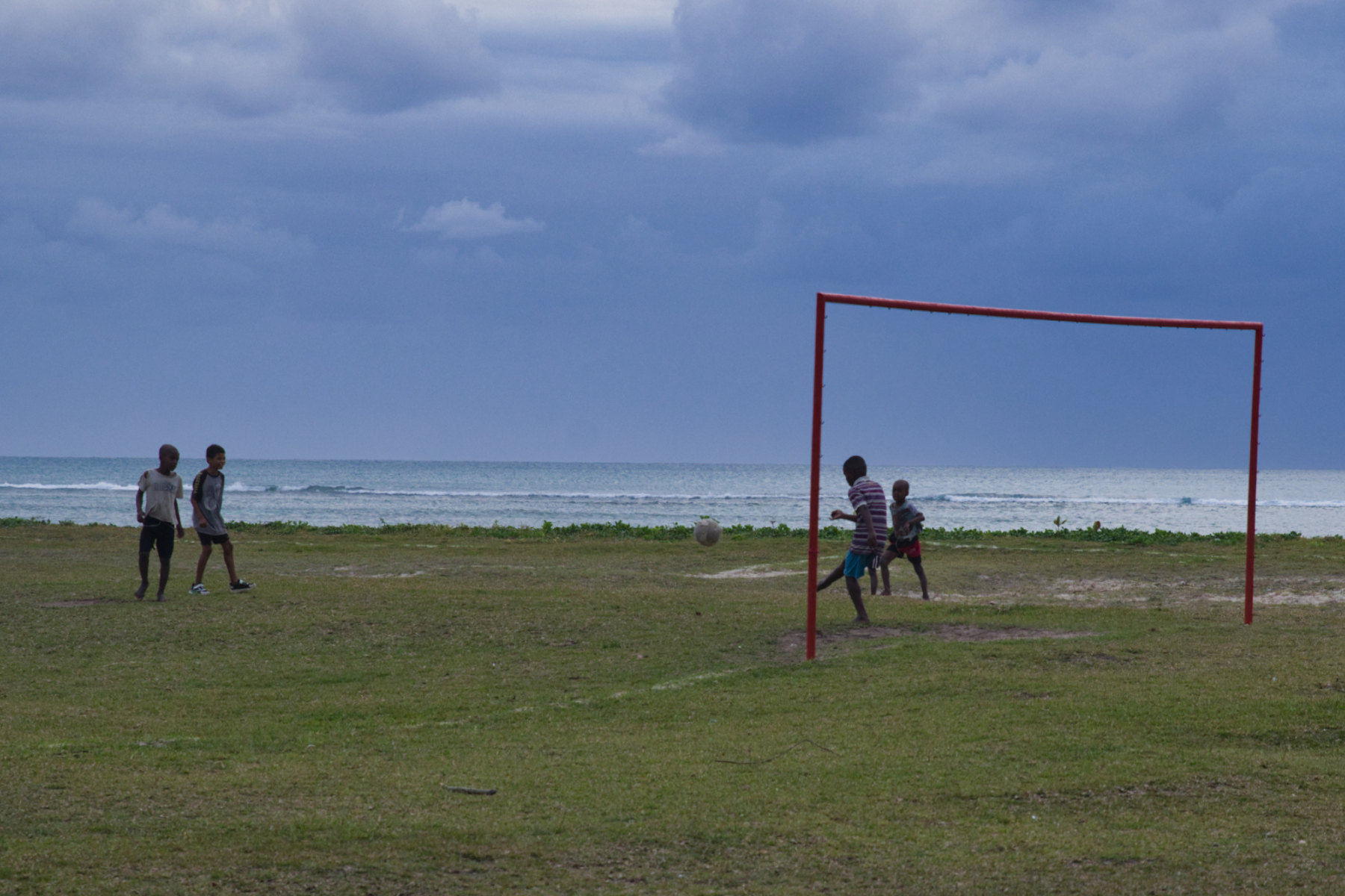 Am Nachmittag hört es auf zu schütten, wir spazieren herum und nehmen ein wenig Lokalkolorit auf. Süßkartoffenfelder, buntes Leben in den Dörfern im Inselinneren, viele Kinder, freundliche Menschen, sogar wenn man sich einmal in fremde Gärten verirrt. Einzelne Zebus, viele Hühner und Enten werden gehalten. Fußball steht bei den Einwohnern hoch im Kurs. Trainiert wird laufend rund ums Zebu, Damen- und Herrenmannschaft getrennt. Ich fände eigentlich die Inselrunde die interessantere Laufstrecke.