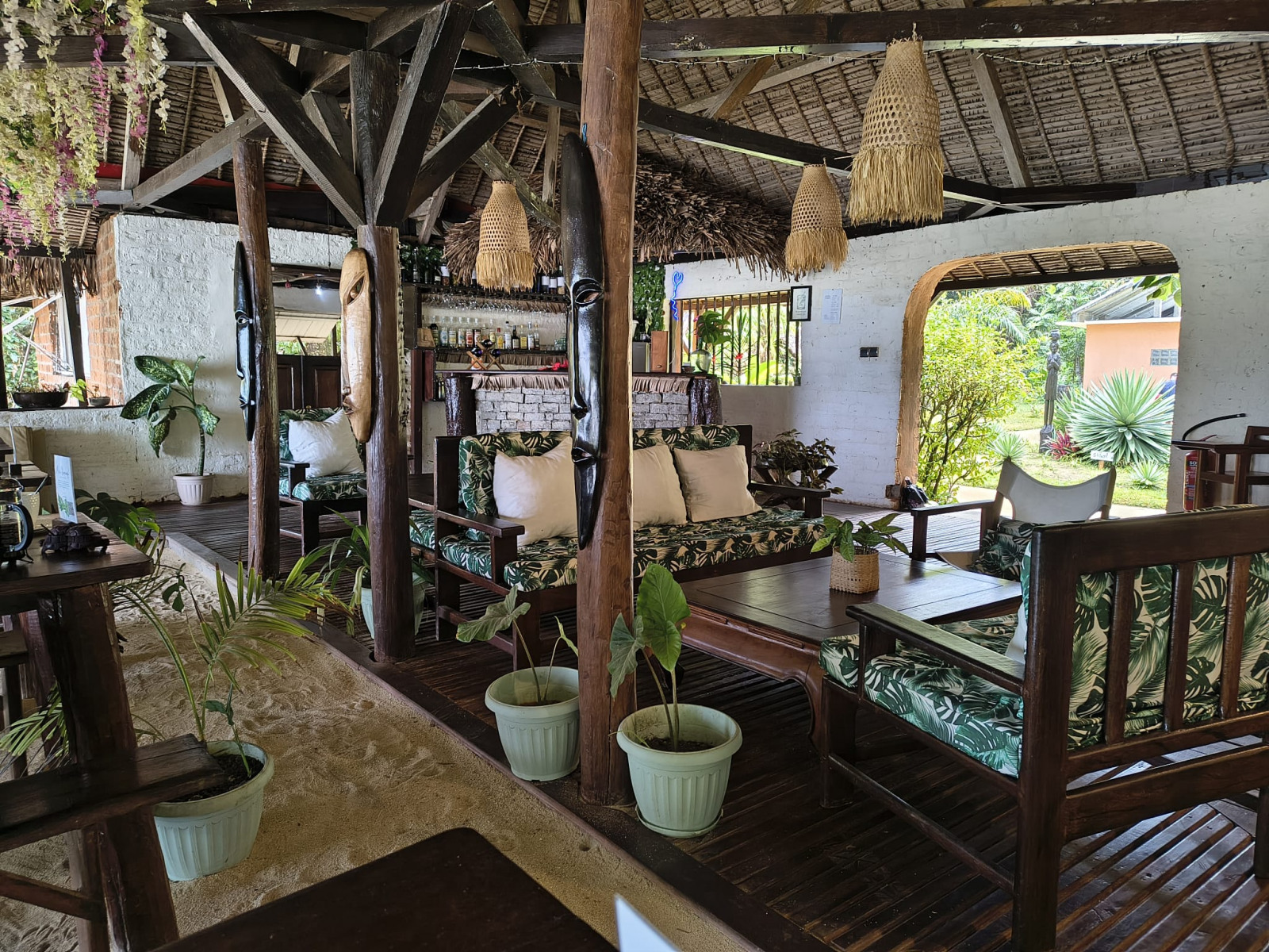 Jetzt ist es nicht mehr weit (1,5 Stunden für 39 km) zu unserem Hotel am Fährhafen Mahambo, wo wir, wieder einmal upgegradet, unseren „luxary bungalow facing the sea“ beziehen.