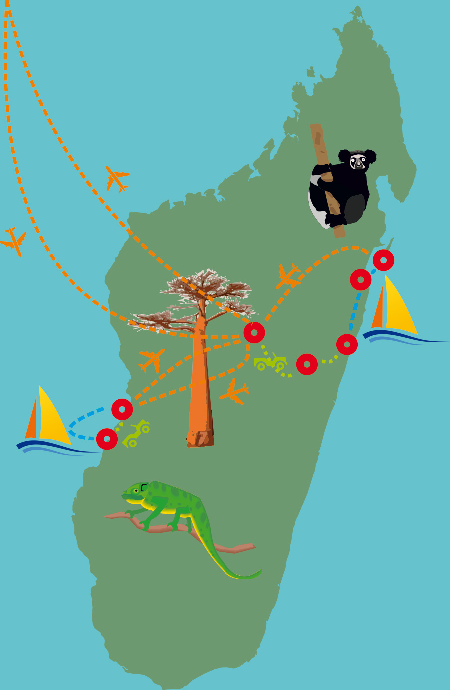 Zu Land zu Wasser und in der Luft wollen wir die Regenwälder des Ostens, die Geburtsstätten der Buckelwale und die Tropeninsel Ile aux Nattes besuchen, dann im Westen den Dornenwald, die Trockenwälder und Koralleninseln erkunden, mit den Vezo segeln und zu guter letzt noch ein wenig Kultura rund um die Hauptstadt genießen. – Soweit der Plan.